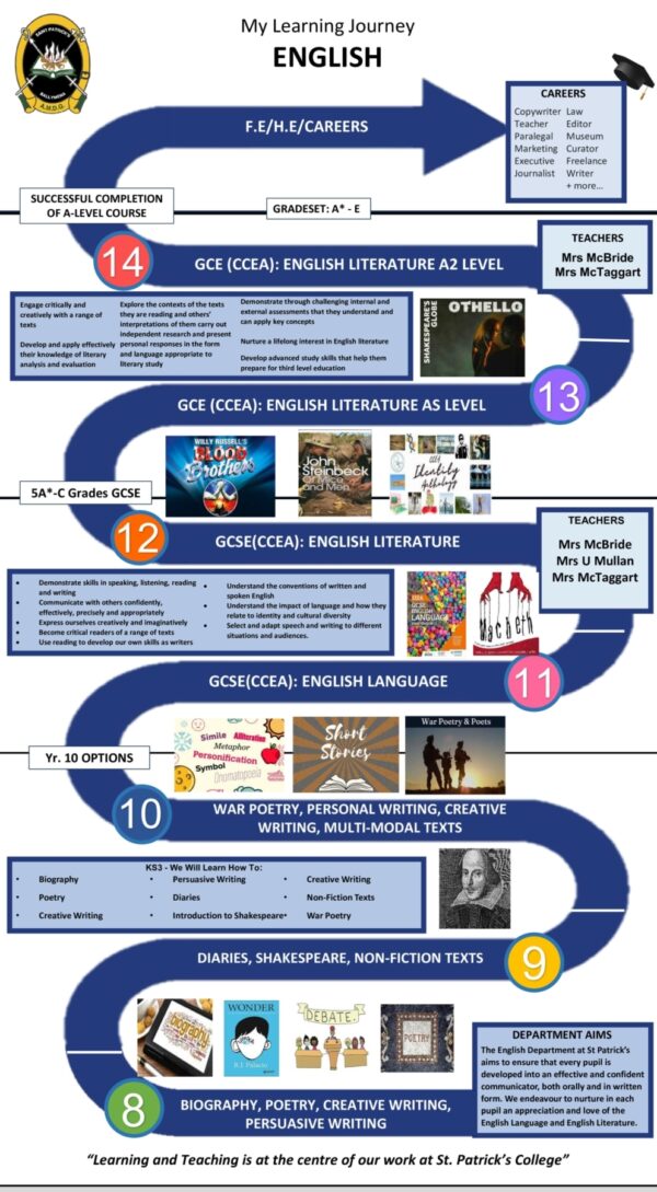 In St. Patrick’s College, the English Department aims to ensure that every pupil is developed into an effective and confident communicator, both orally and in written form. Teachers endeavour at all times to be imaginative in their teaching, to facilitate encounters with as wide a range of literature as possible, and to promote enjoyment of English across all ability ranges. They seek to make their classes lively and interesting, with a high degree of student participation.