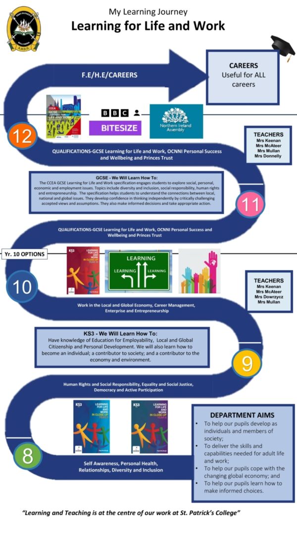 Learning for Life and Work is offered to KS3 and KS4 pupils and reflects the aims of St. Patrick’s College and meets the objectives of the N.I. Curriculum by contributing directly to developing the young person as: