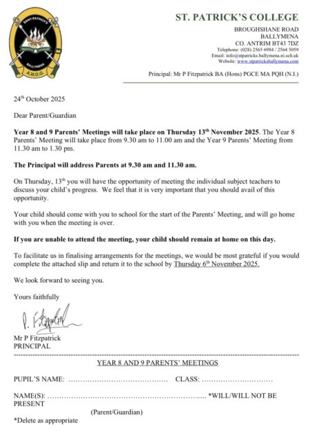 The Year 8 Parent Teacher Meeting will take place from 9.30 to 11.00am, while the Year 9 Meeting will take place from 11.30am to 1.30pm. Pupils should come to the meeting (in uniform) with their parent/guardian and will go home with them after the meeting.
